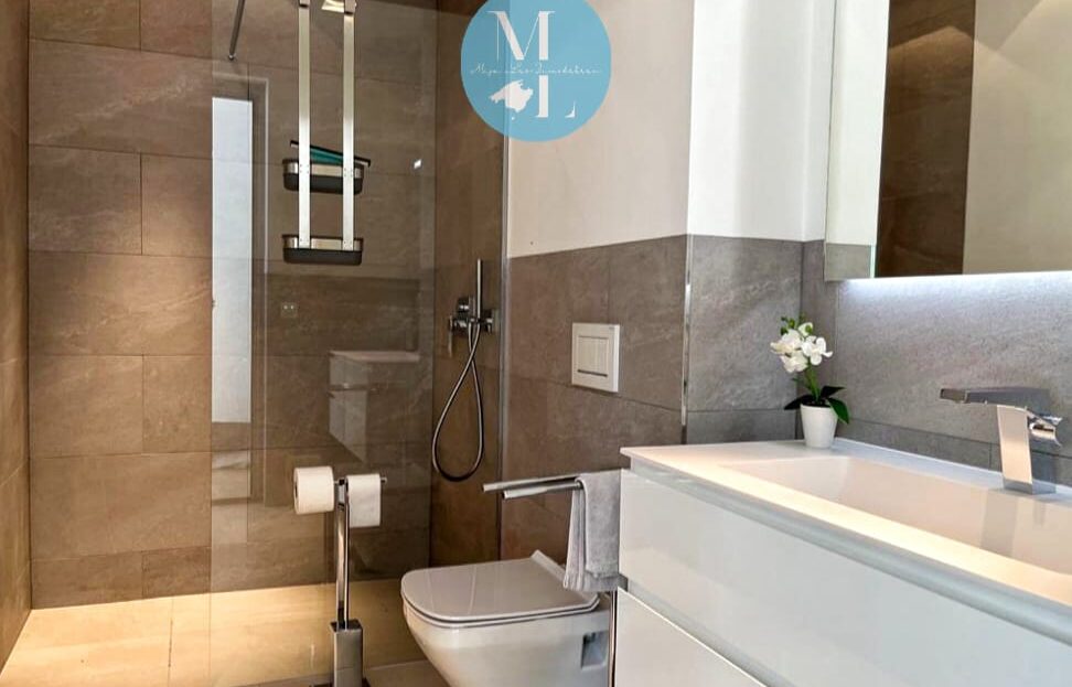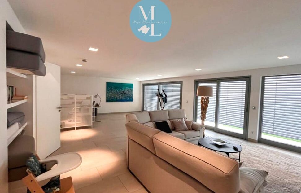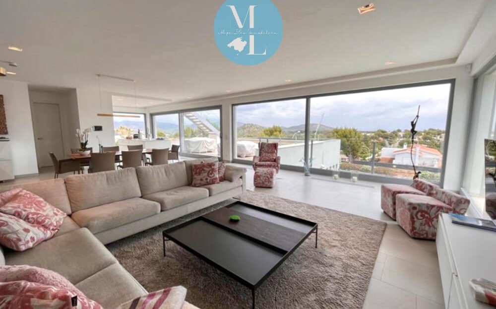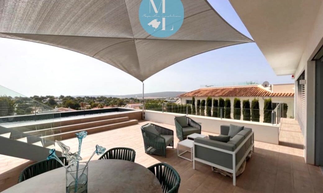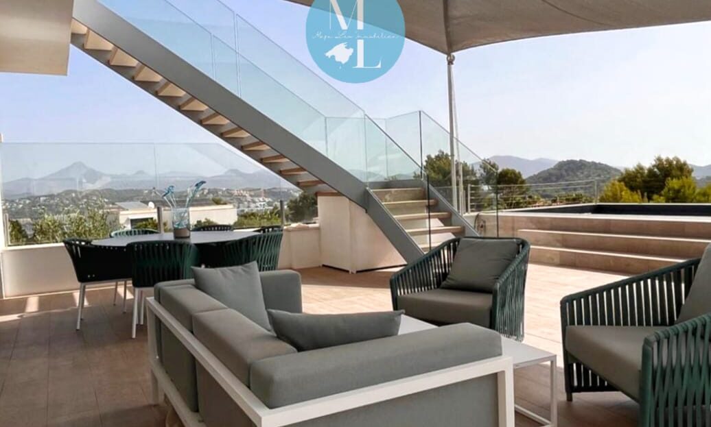 Von hier aus gelangen Sie auf eine großzügige Terrasse mit ca. 55 m², die ausreichend Platz für Lounge- und Essbereiche bietet und Zugang zu einem der beiden Swimmingpools gewährt. Ein besonderes Highlight ist die spektakuläre Dachterrasse mit 360°-Panoramablick auf die umliegende Landschaft und das Meer – ein perfekter Ort, um die Sonnenuntergänge Mallorcas zu genießen.