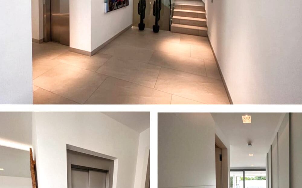 Bereits beim Betreten der Villa im Obergeschoss eröffnet sich ein lichtdurchfluteter, offen gestalteter Wohnbereich. Bodentiefe Fenster lassen das mediterrane Licht in alle Räume fließen und schaffen eine harmonische Verbindung zwischen Innen- und Außenbereich. Das elegante Wohnzimmer, der stilvolle Essbereich sowie die hochwertige Designerküche von Leicht mit Kochinsel und integriertem Weinkühlschrank bilden das Herzstück dieser Ebene – ideal für gesellige Abende und entspanntes Wohnen.