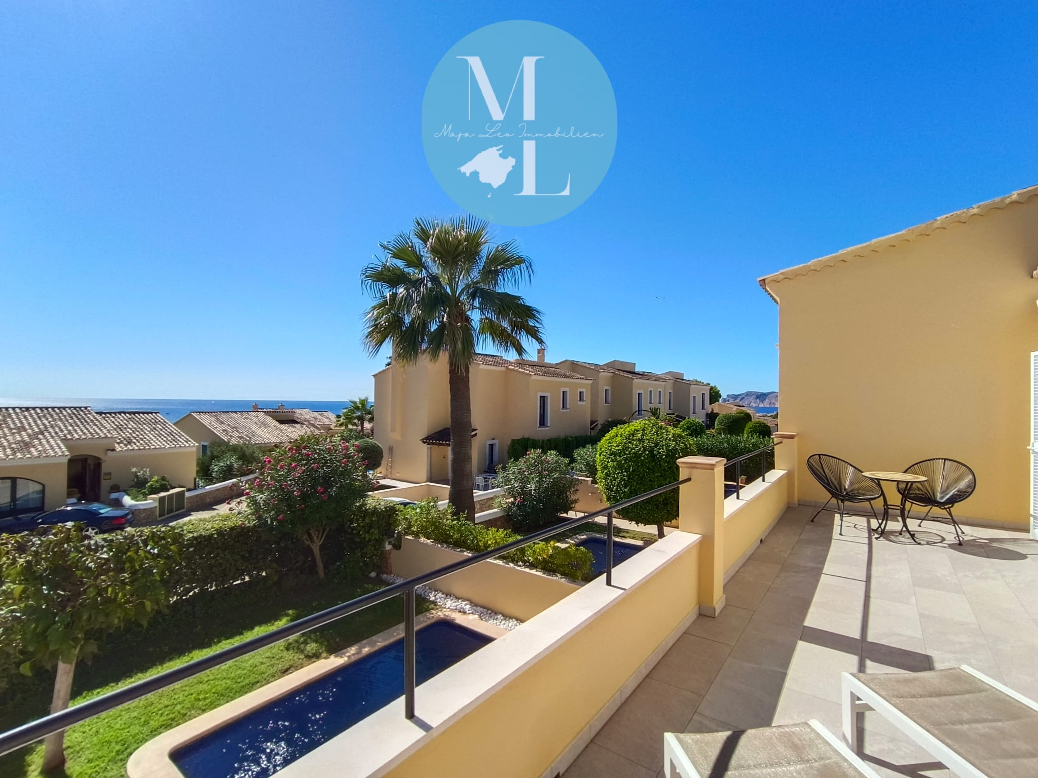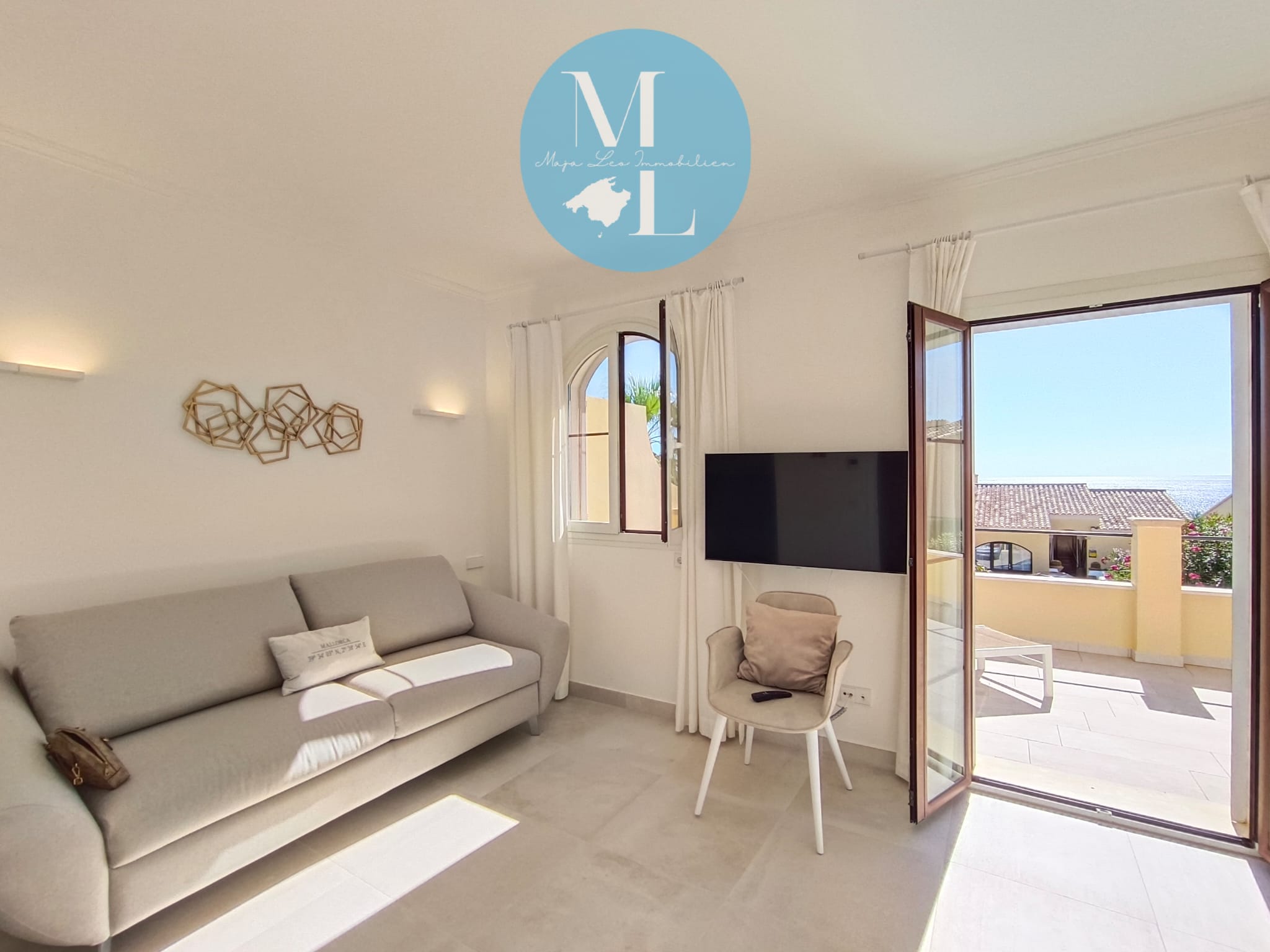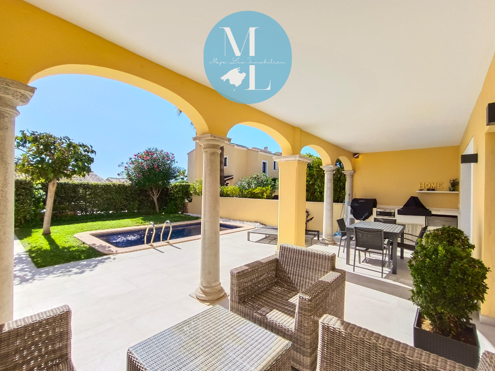 Die großzügige Terrasse mit integrierter Außenküche lädt zu entspannten Abenden mit Familie und Freunden ein – begleitet von einem traumhaften Meerblick, der jeden Moment zu etwas Besonderem macht.