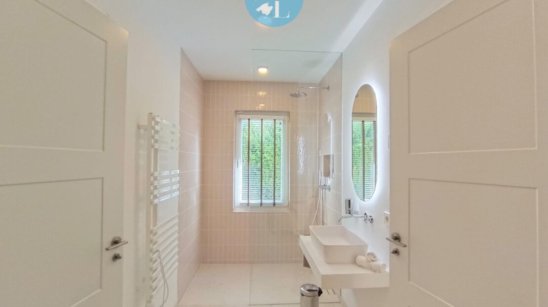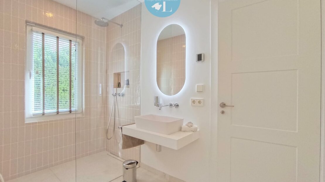 Weitere Ausstattungsmerkmale wie eine Doppelgarage mit Vorbereitung für eine E-Ladestation, Wasserenthärtungs- und Umkehrosmoseanlage, schlüsselloses Zugangssystem sowie barrierefreie Anpassungen runden das hochwertige Gesamtbild ab.